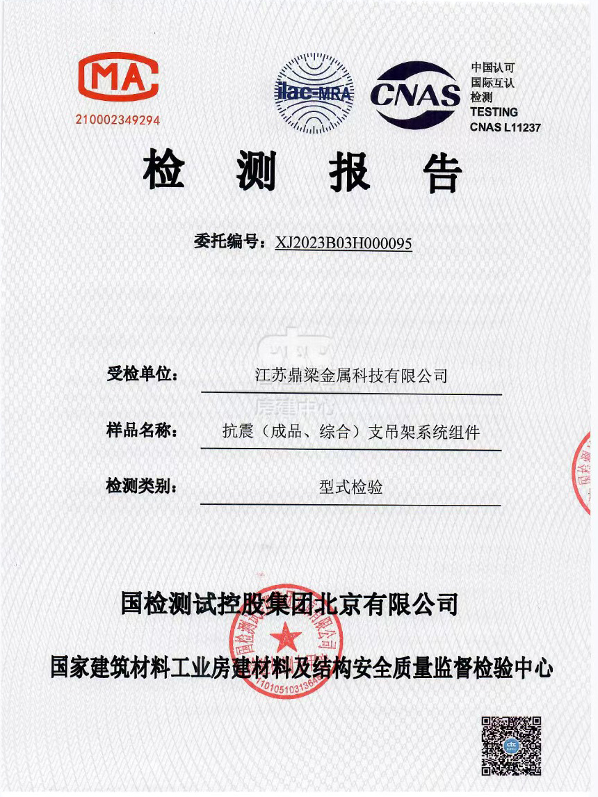 尊敬的用户,您所查询的是由国家建筑材料工业房建材料及结构安全质量监督检验中心出具的 江苏鼎梁金属科技有限公司的抗震(成品、综合)支吊架系统组件的检测报告。
